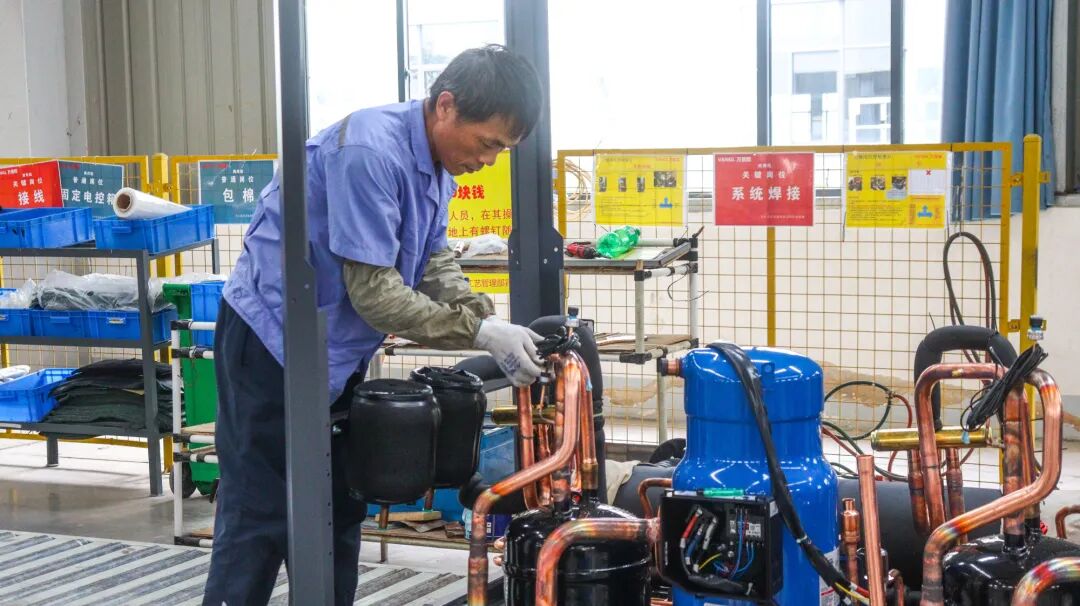 自动化处理机器轰鸣作响,零配件物料车往来穿梭,多条生产线“马力全开”……工人们正各司其职,忙着完成焊接、组装、检测等道道工序,赶制一批批“水空调”产品。记者在家用机型厂房生产线上看到,平均每分钟就有2台家用“水空调”外机组装完成下线。