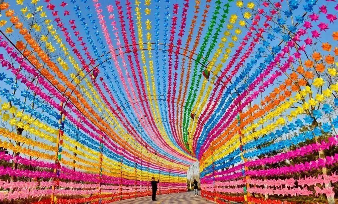 整个园区装饰着数不清的绚烂风车,让人仿佛置身于七彩童话世界。行走在百米风车长廊,与风车艺术造型合影,让秋风给你带去浪漫与祝福。