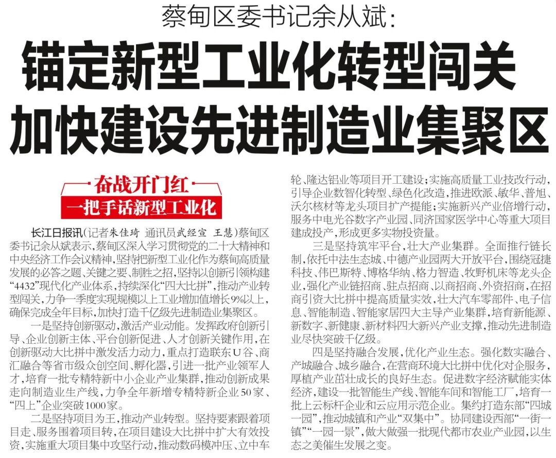 蔡甸区委书记余从斌表示,蔡甸区深入学习贯彻党的二十大精神和中央经济工作会议精神,坚持把新型工业化作为蔡甸高质量发展的必答之题、关键之要、制胜之招,坚持以创新引领构建“4432”现代化产业体系,持续深化“四大比拼”,推动产业转型闯关,力争一季度实现规模以上工业增加值增长9%以上,确保完成全年目标,加快打造千亿级先进制造业集聚区。