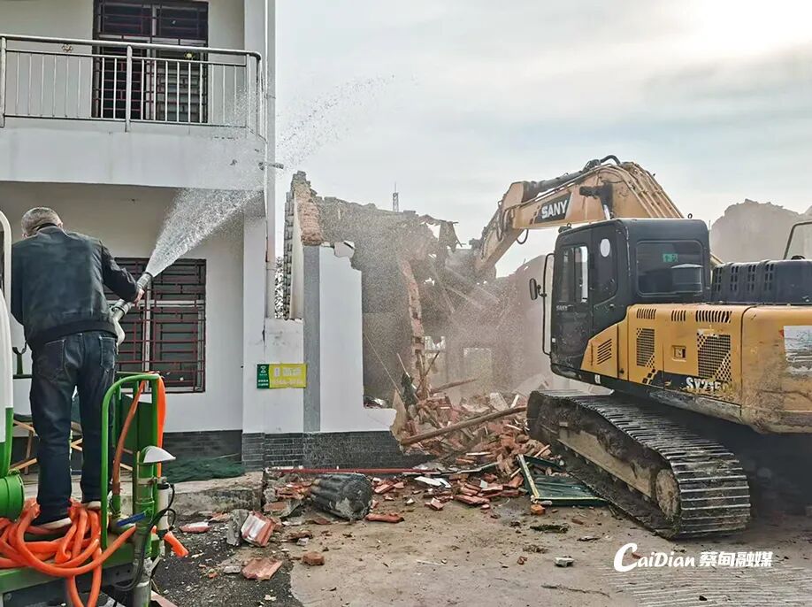 房屋征收现场,挖掘机高举铁臂重凿屋顶,对征收房屋主体进行拆除。房屋两旁,洒水车全程喷雾降尘,避免二次扬尘污染;警戒线外,项目专班成员有条不紊地指挥着现场秩序,全力保障征迁安全。