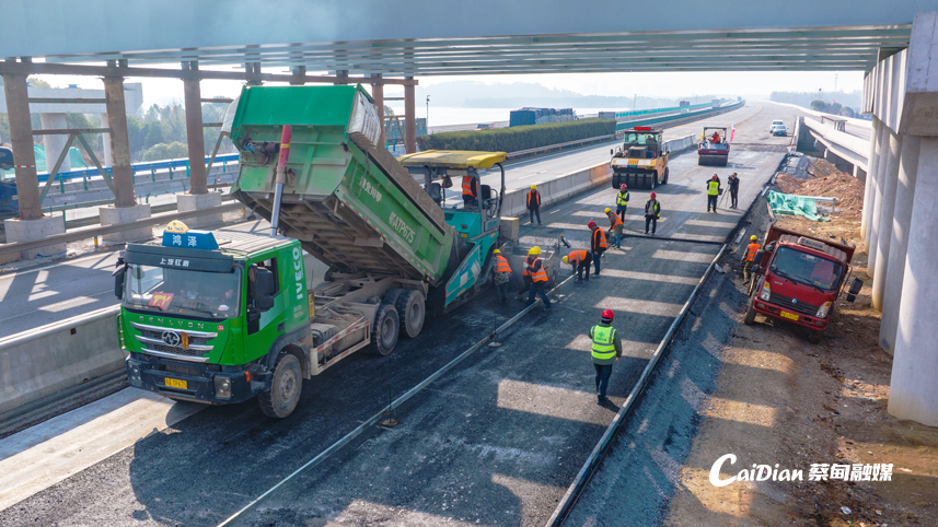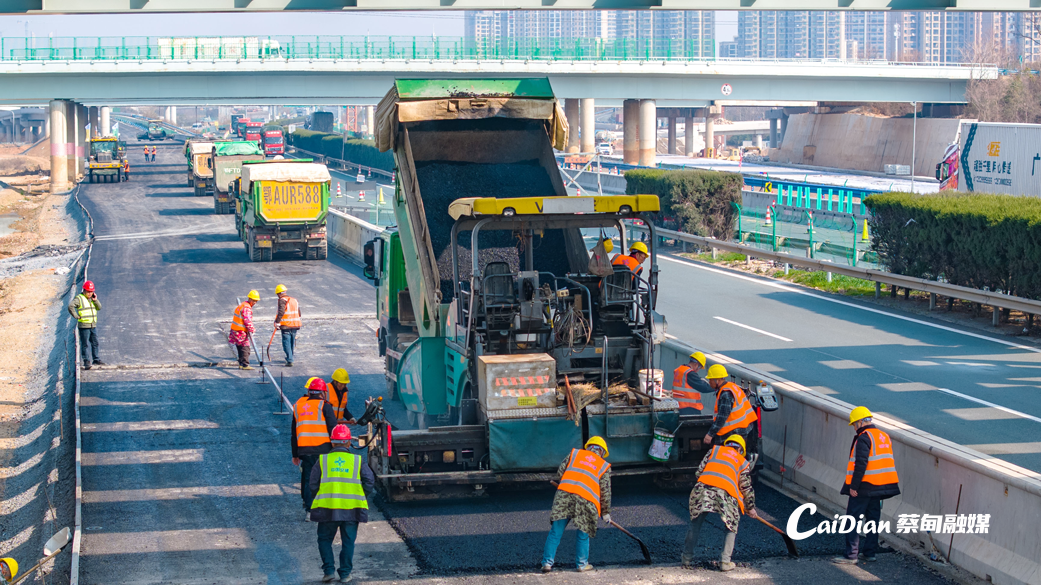 京港澳高速改扩建工程7标蔡甸段正在施工的段落桩号为K1162+600至K1172+800。高速公路沥青路面结构为四层,目前右幅第一层沥青已完成10.5公里铺设,第二层沥青铺设已经进入收尾阶段;左幅已完成第一层沥青7.5公里铺设,正准备进行第二层沥青铺设作业。