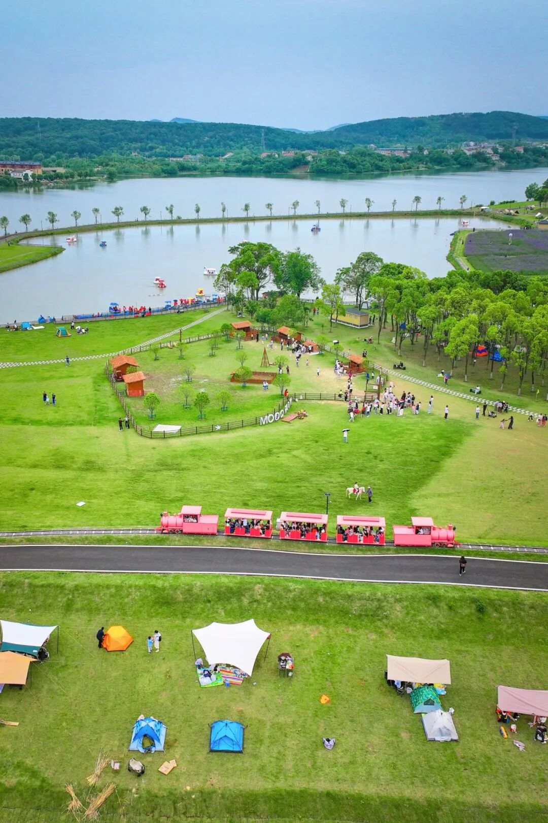 童话风的牧川·漫生活生态乐园,主打露营,草坪一直铺到湖边,依山傍水,景色怡人。这里有霍比特人小屋、无动力游乐园,可以玩滑翔伞、竹筏船,公共区域的空地都可以露营(帐篷可以扎到湖边、花海边、林荫底下)。