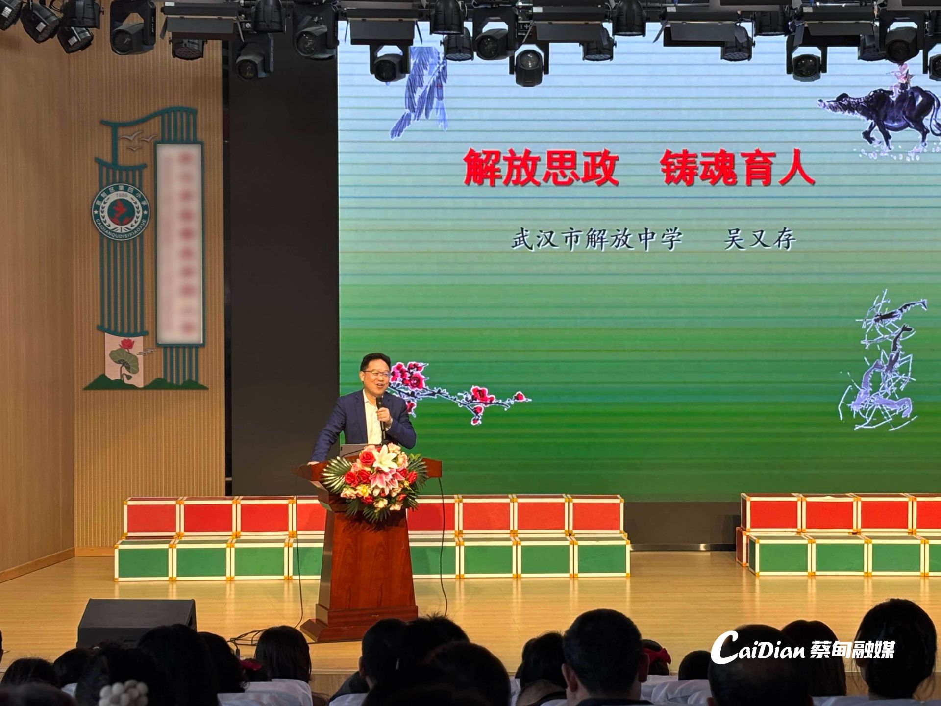 活动特邀教育部大中小学思政课一体化建设专家指导组成员、全国模范教师、武汉市解放中学副校长吴又存作专家宣讲。他以《解放思政 铸魂育人》为主题,通过“看好视频、讲好故事、诵好诗词、做好作业”的实践路径,系统阐述了“解放思政”教学主张如何实现铸魂育人的目标,其深入浅出的讲解为全场师生带来深刻的思想启迪。