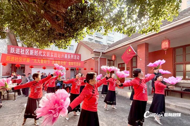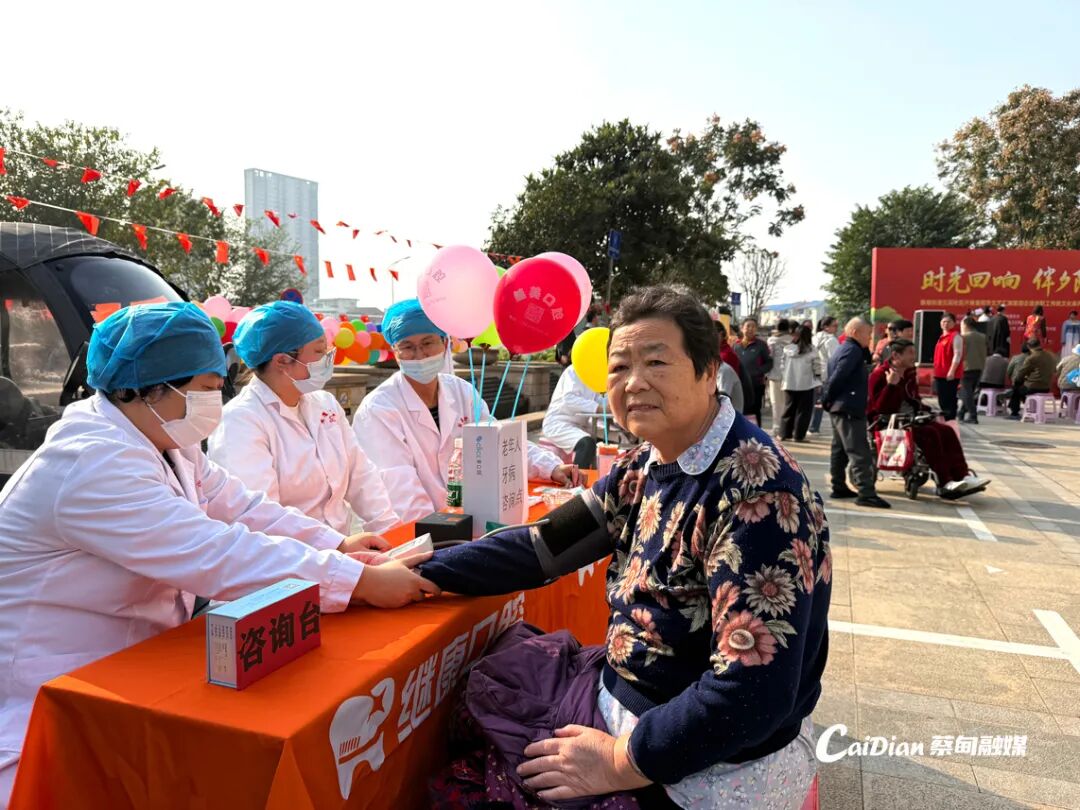 五层社区设置义诊区为老人测量血压、检测血糖,并解答慢性病管理相关问题;打卡拍照区布置了重阳主题背景板,志愿者协助老人拍照留念;现场还举办文艺汇演,老人们乐在其中。