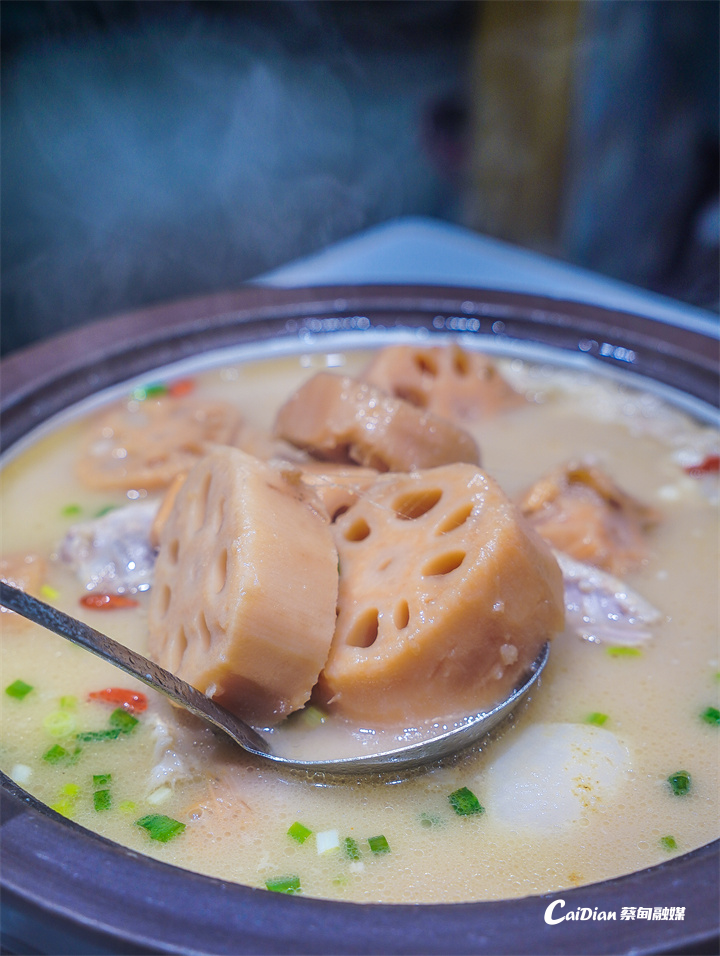 蔡甸宴选用蔡甸九孔藕,搭配鲜骨慢煨,还巧妙融入本地食材特色。藕块粉糯带甜,吸饱醇厚汤汁;汤色清亮却香气馥郁,入口温润不腻。从食材甄选到慢煨工艺,再到精致摆盘,每一处都尽显用心,妥妥的宴请聚会首选,让藕香与格调兼得。
