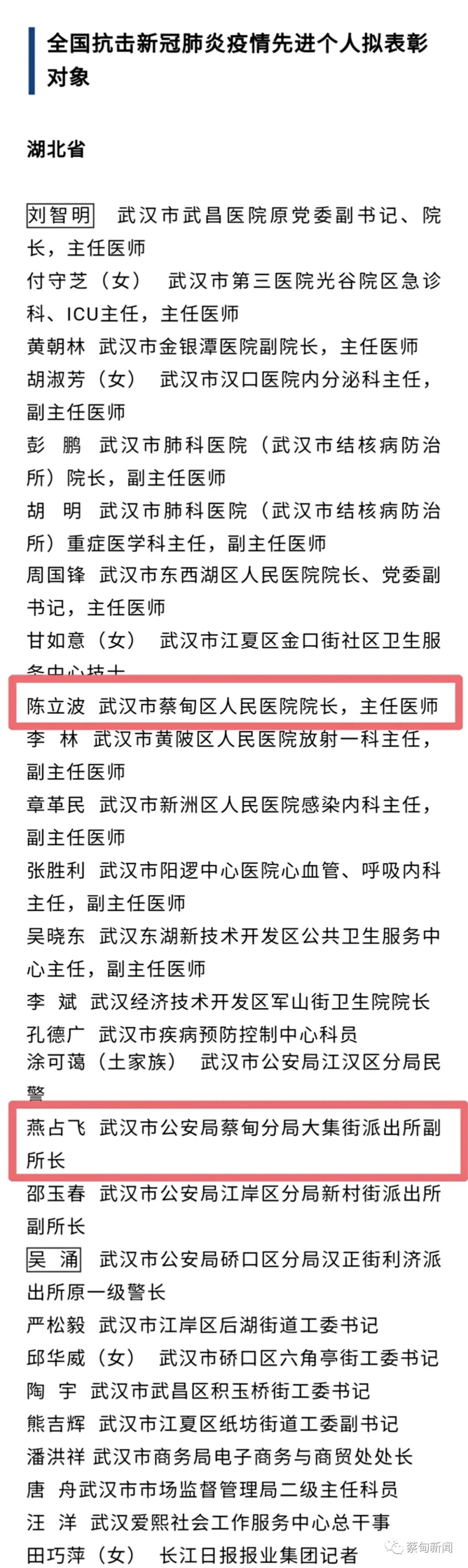 8月28日,抗击新冠肺炎疫情国家级表彰拟表彰对象进行公示。湖北省武汉市蔡甸区陈立波、燕占飞2人因抗击新冠肺炎疫情事迹突出,被确定为全国抗击新冠肺炎疫情先进个人拟表彰对象。