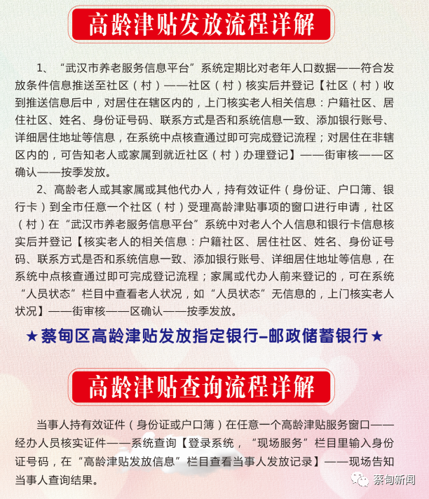 “高龄津贴的发放对象是武汉市户籍、年满80周岁的高龄老人(以身份证出生年月为始发依据),符合年龄条件的驻汉军队离退休人员(无武汉市户籍)。”蔡甸区民政局相关负责人介绍,高龄津贴首次登记时间高龄津贴以身份证出生年月为始发依据,对即将年满80周岁提前两个月进行个人信息登记,建立电子档案。