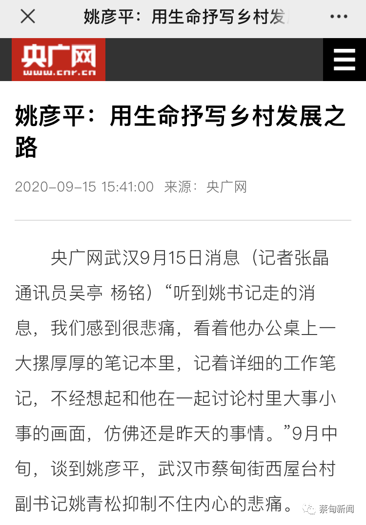 9月15日,央广网聚焦报道湖北省武汉市蔡甸区基层好干部姚彦平的感人事迹。