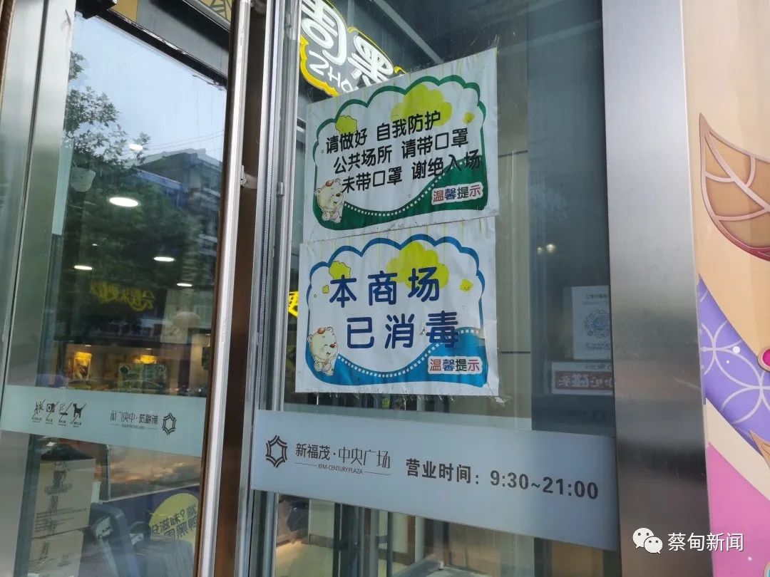 在新福茂中央购物广场,门口张贴着提醒市民戴口罩的温馨提示语。作为蔡甸区城关的大型商业购物中心,目前商场内的商户都已基本恢复经营,商场每天安排消杀人员对重点区域进行消毒。