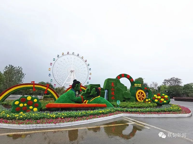 在公园的大门口,庆祝中华人民共和国成立71周年的鲜红雕塑分外醒目,一旁伯牙与子期的花卉人物布景也十分吸引眼球。