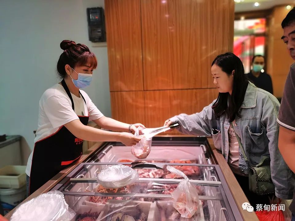 在菜市场门口,摆放着测量体温的座椅,专人在门口手持体温枪对进入市场的市民进行体温测量。进入菜场,记者就感受到了菜市场的干净整洁,尤其是在环境设计上独具匠心。菜市场被分为蔬菜、肉类、水产、熟食、净菜5个大区。不同区域摊贩上方的颜色标识都不一样,蔬菜是绿色标识,肉类为红色,熟食区是橙色......在菜场内上方,新风系统不停运转,市场内的保洁员不间断巡查和清扫。