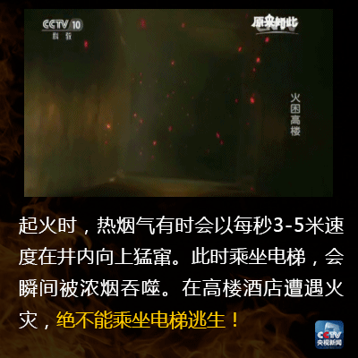 3. 楼房起火时,不乘普通电梯逃生,因为起火很容易断电,或者使电梯轿厢受热变形卡壳而使逃生失败。