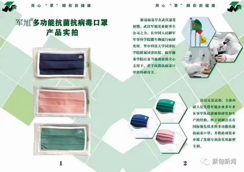 日前,由蔡甸辖区企业武汉军旭实业有限责任公司与相关科研院校研发而成的多功能抗菌抗病毒口罩已面世。经过国际权威部门检测,这种专用口罩具有世界领先技术,细菌过滤率达到95%以上,抑菌率达到99%以上,具有杀活新冠病毒和流感病毒的功效。