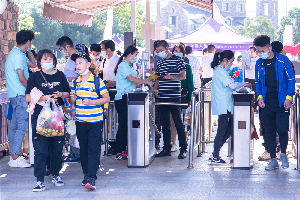 19日,记者来到景区,看到很多游客携家带口前来游玩。进入园区的游客需佩戴口罩、出示健康码、经过测温区进行体温检测,按提示间隔排队,依次有序入园。每个为游客服务的窗口,均展示着服务人员最新的核酸检测公示信息。