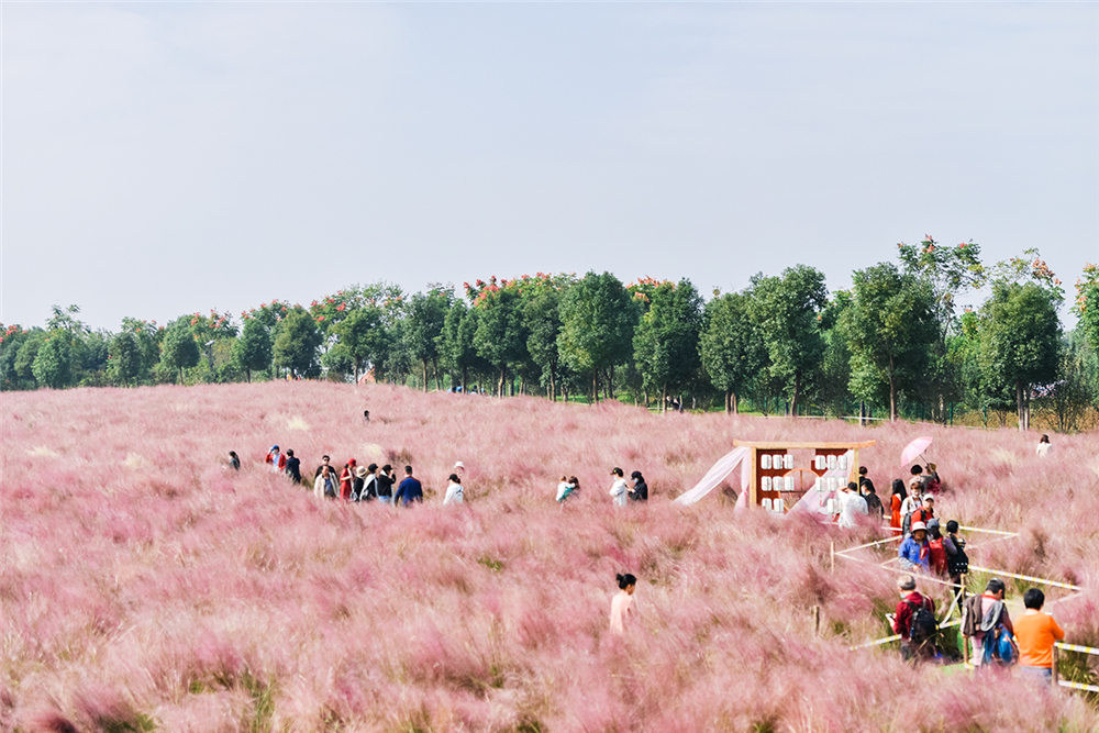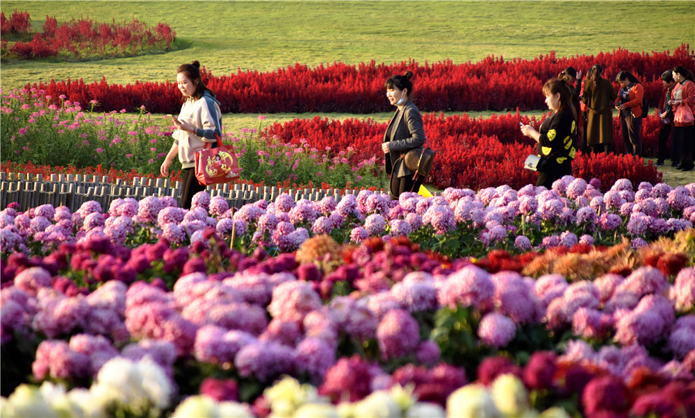游客在景区可以观赏到清新淡雅的菊花花海、梦幻粉嫩的粉黛花海,还有百日草、鸡冠花、醉蝶花、玫瑰等连片花海盛开的壮观景象。