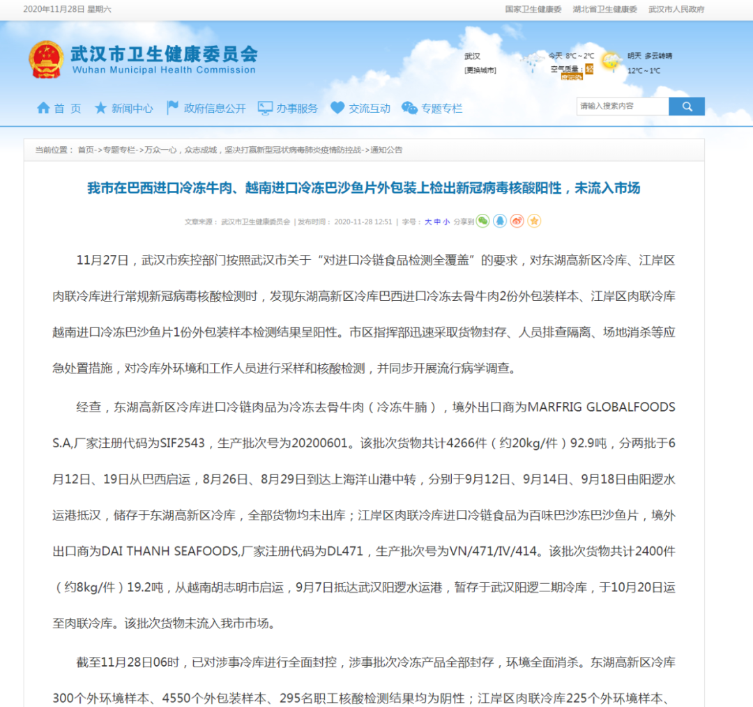 截至11月28日06时,已对涉事冷库进行全面封控,涉事批次冷冻产品全部封存,环境全面消杀。东湖高新区冷库300个外环境样本、4550个外包装样本、295名职工核酸检测结果均为阴性;江岸区肉联冷库225个外环境样本、3777个外包装样本、886名职工核酸检测结果均为阴性。