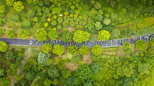 在江苏省淮安市,体育爱好者在淮安森林公园进行“全民健步走”活动(8月7日摄,无人机照片)。新华社发(干石泉 摄)