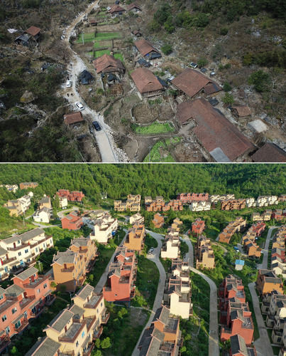 拼版照片上图:这是整屯搬迁前的广西南丹县里湖瑶族乡董甲村么干屯(2018年1月10日摄)。村民们都搬迁到“千家瑶寨·万户瑶乡”里湖王尚易地扶贫搬迁安置点。下图:这是广西南丹县“千家瑶寨·万户瑶乡”里湖王尚易地扶贫搬迁安置点(8月4日摄,无人机照片)。新华社记者 周华 摄