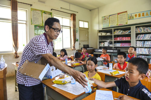 在广西武宣县二塘镇双桂小学,老师韦旭禧给学生们发牛奶(6月19日摄)。新华社记者 曹祎铭 摄