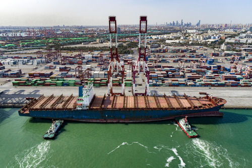 10月27日,一艘货轮停靠天津港。天津港集团正式开通运营今年第四条“一带一路”新航线(无人机照片)。新华社发