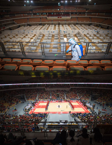 拼版照片上图:3月8日,武汉体育中心方舱医院送走最后一批痊愈患者,正式休舱。随后,舱内进行全面消毒工作。这是志愿者在进行消杀作业。下图:10月4日,武汉体育中心方舱医院休舱后举行首场大型赛事。新华社记者 肖艺九 摄