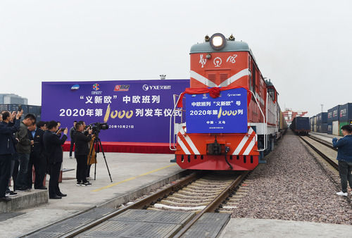 10月21日,2020年第1000列“义新欧”中欧班列从铁路义乌西站发车。新华社发(龚献明 摄)