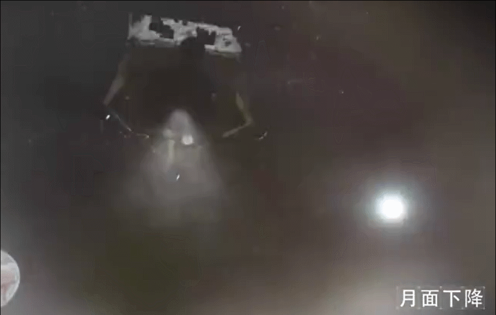 期间,探测器进行快速姿态调整,逐渐接近月表;此后进行障碍自动检测,选定着陆点后,开始避障下降和缓速垂直下降,平稳着陆在位于月球正面风暴洋的吕姆克山脉以北地区。着陆过程中,着陆器配置的降落相机拍摄了着陆区域影像图。