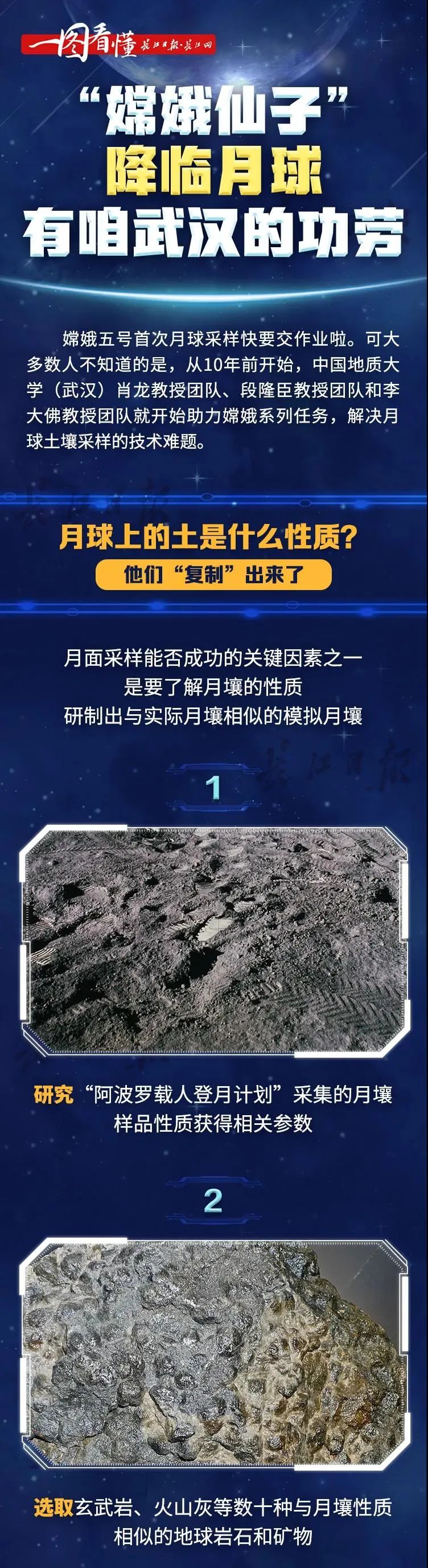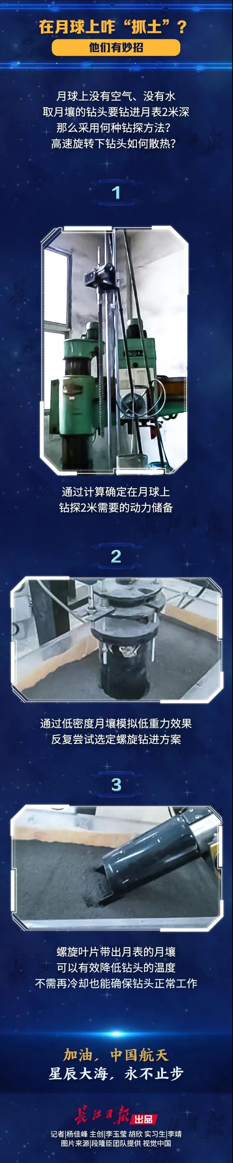早在10年前中国地质大学(武汉)肖龙教授团队、段隆臣教授团队和李大佛教授团队接受任务为嫦娥系列任务研制模拟月壤绘制采样点地质地貌地图研究使用何种钻探方法取样采用何种型号钻头十年磨“锄”他们走过了少有人知的科学攻关之路