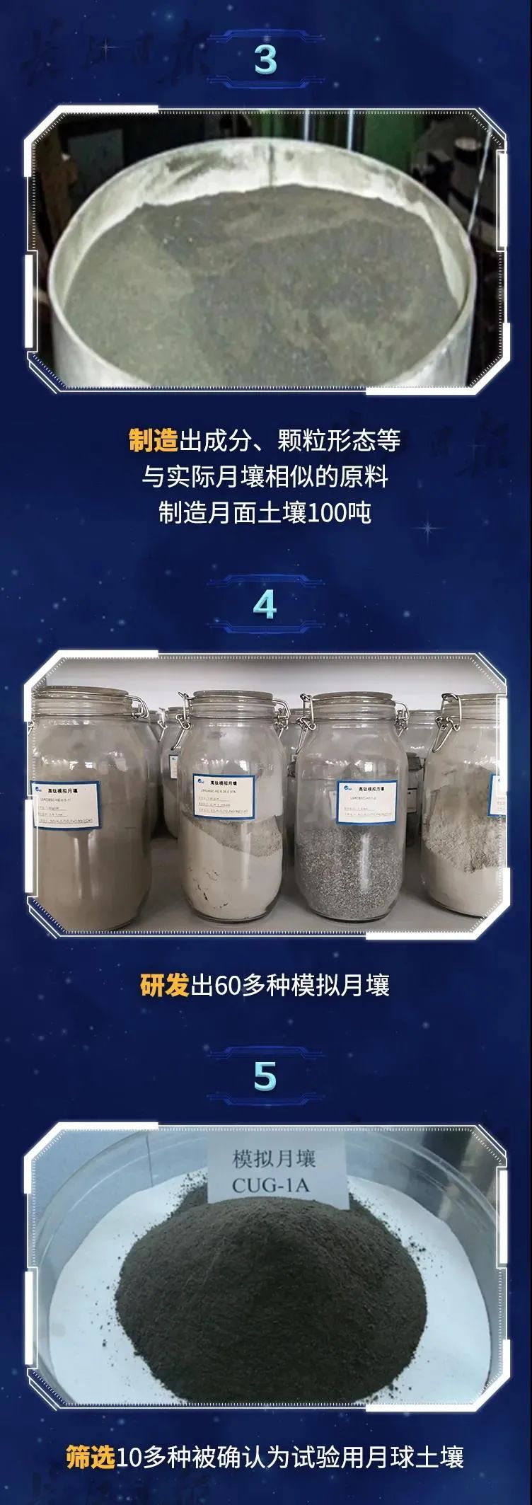 在肖龙教授的实验室兼办公室,桌面上放置最多的就是各种类型的模拟月壤,记录了这一团队10年的奋斗历程。“现在摆在这里的已经很少了,最多时房间里根本摆不下,都移放到车库里了,同样也是塞得满满的。”肖龙说,试验需要用到大量的岩石、土壤等原材料,实验室放不下,他把自家的车库改为了临时仓库。