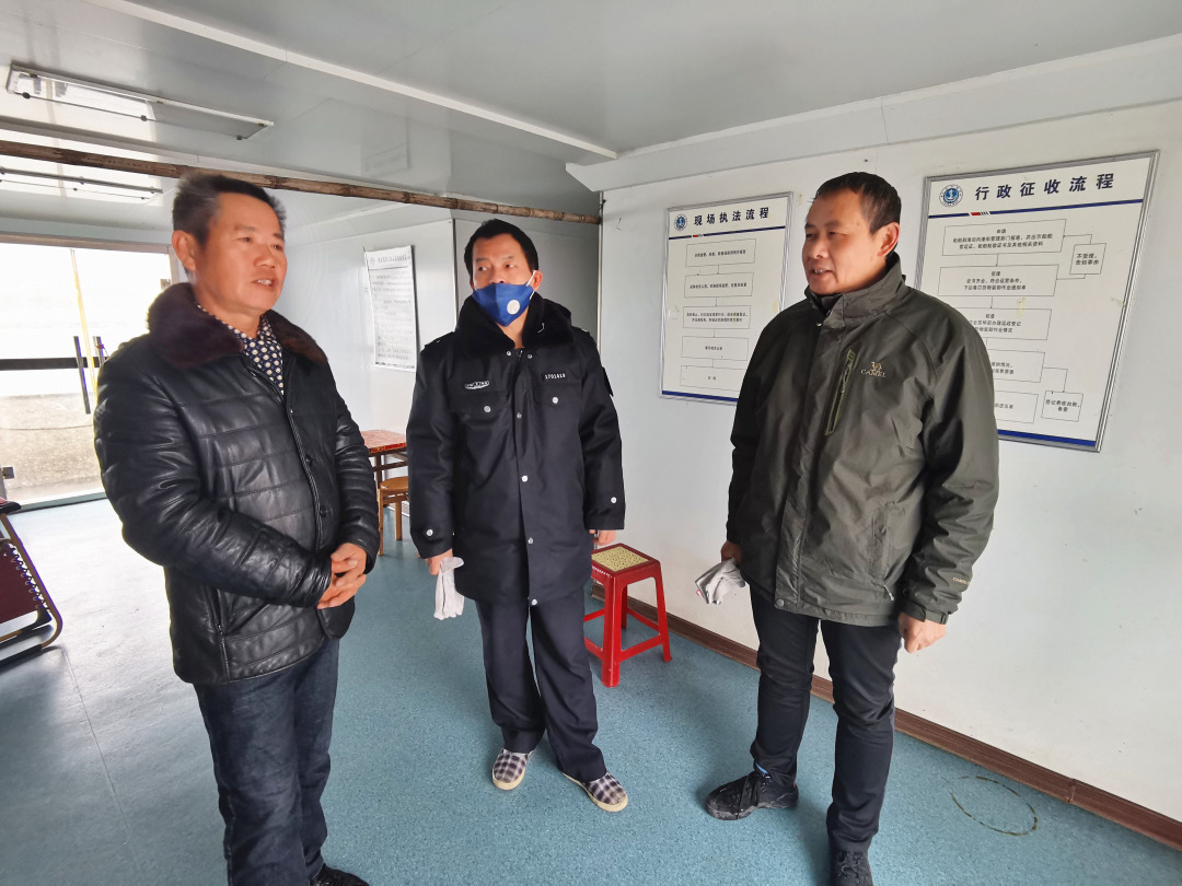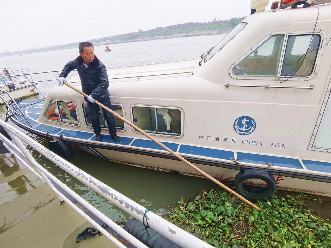 12月7日上午9时,寒风瑟瑟,胡汉桥和往常一样,将渔政执法船里里外外检查一遍,清除完船边的水草后,准备随执法人员一道进行沿江巡逻。