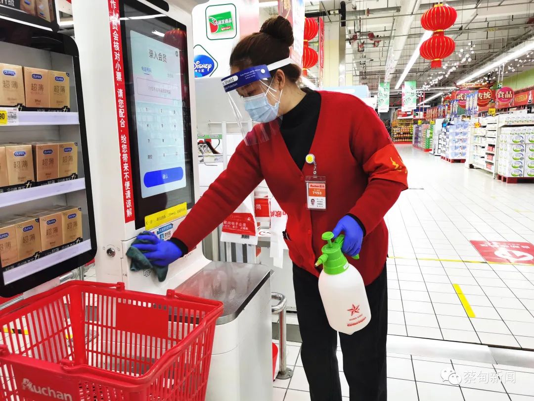 在超市内,记者随处可见疫情防控温馨提示,工作人员定时对收银区域、公共区域、购物篮等进行消毒杀菌。