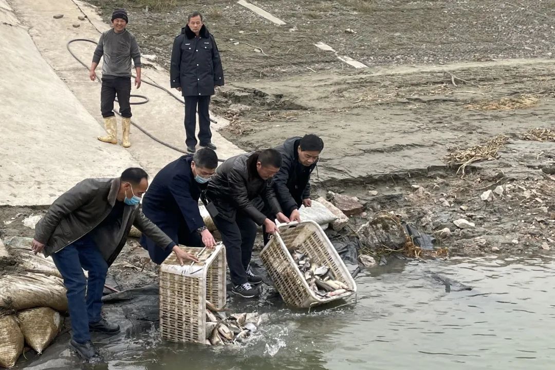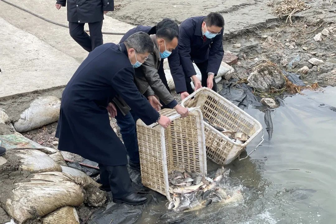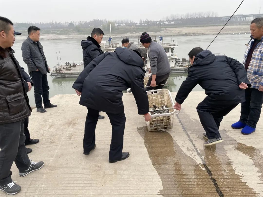 近日,武汉市蔡甸区检察院检察官与法院承办法官、农业农村局工作人员来到蔡甸区汉江堤防渔政码头,对被告人王某某增殖放流鱼苗进行现场监督,修复因非法捕捞遭到破坏的生态资源。