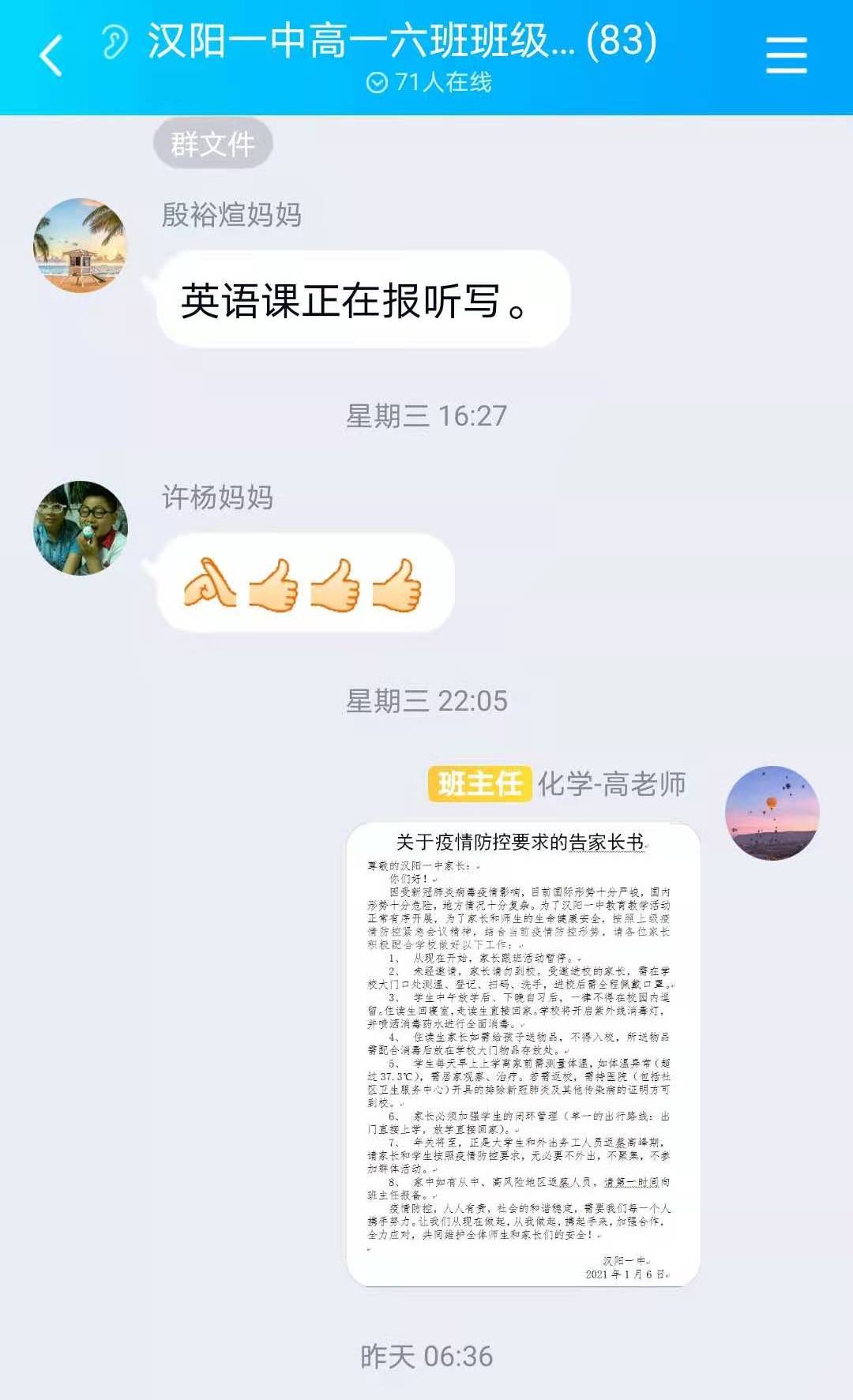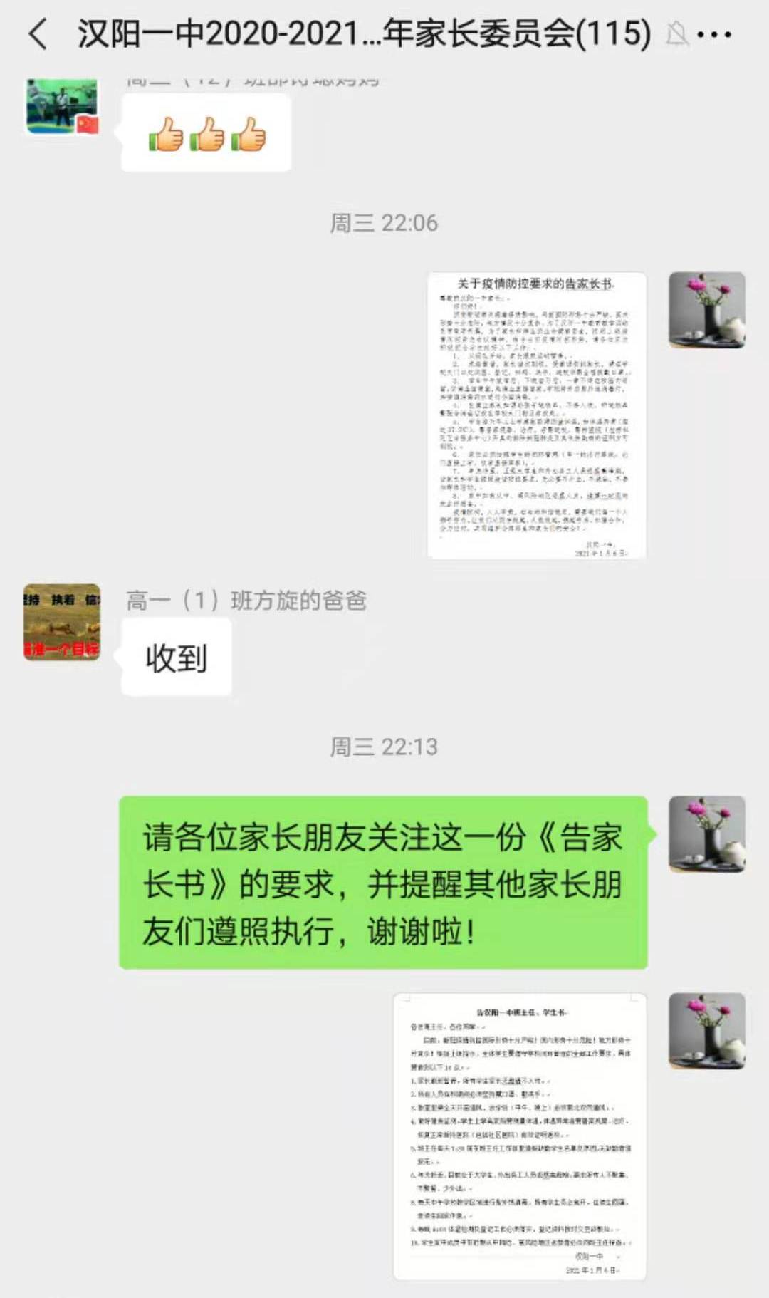 据汉阳一中副校长郑永艳介绍,该校严格做到加强师生的一日三检和病假追踪,每日通过微信,QQ,晨会,班会等多种途径发放了告家长书、告学生书和告教师书,要求全体学生家长和老师齐心协力共同参与疫情防控工作。同步加强门卫门禁管理制度,坚持校园每日至少消杀两次,进一步消除学校卫生死角,确保全校师生的健康安全。