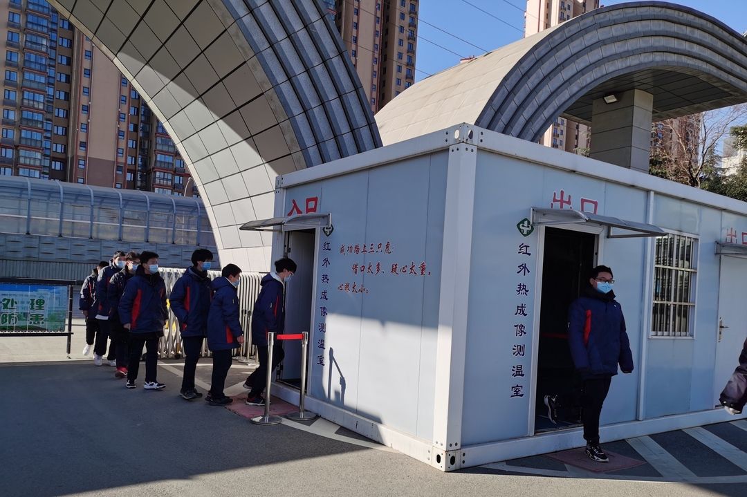 在汉阳一中大门口,每日晨间,学生们需经过红外线测温室,体温无误后进入校园。保安严格落实门禁制度,接送学生的家长一律不得进入校园,坚决杜绝校外无关人员出入学校。校外人员确实需要进入校园的,要通过身份核验登记、查验“健康码”、体温检测等查验制度。