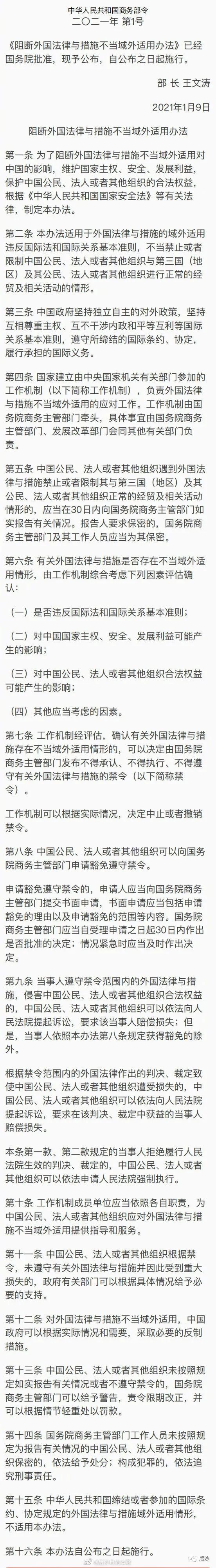 今天,中华人民共和国商务部公布了2021年第1号令-《阻断外国法律与措施不当域外适用办法》,不少媒体也将其称为“重磅反制办法”。