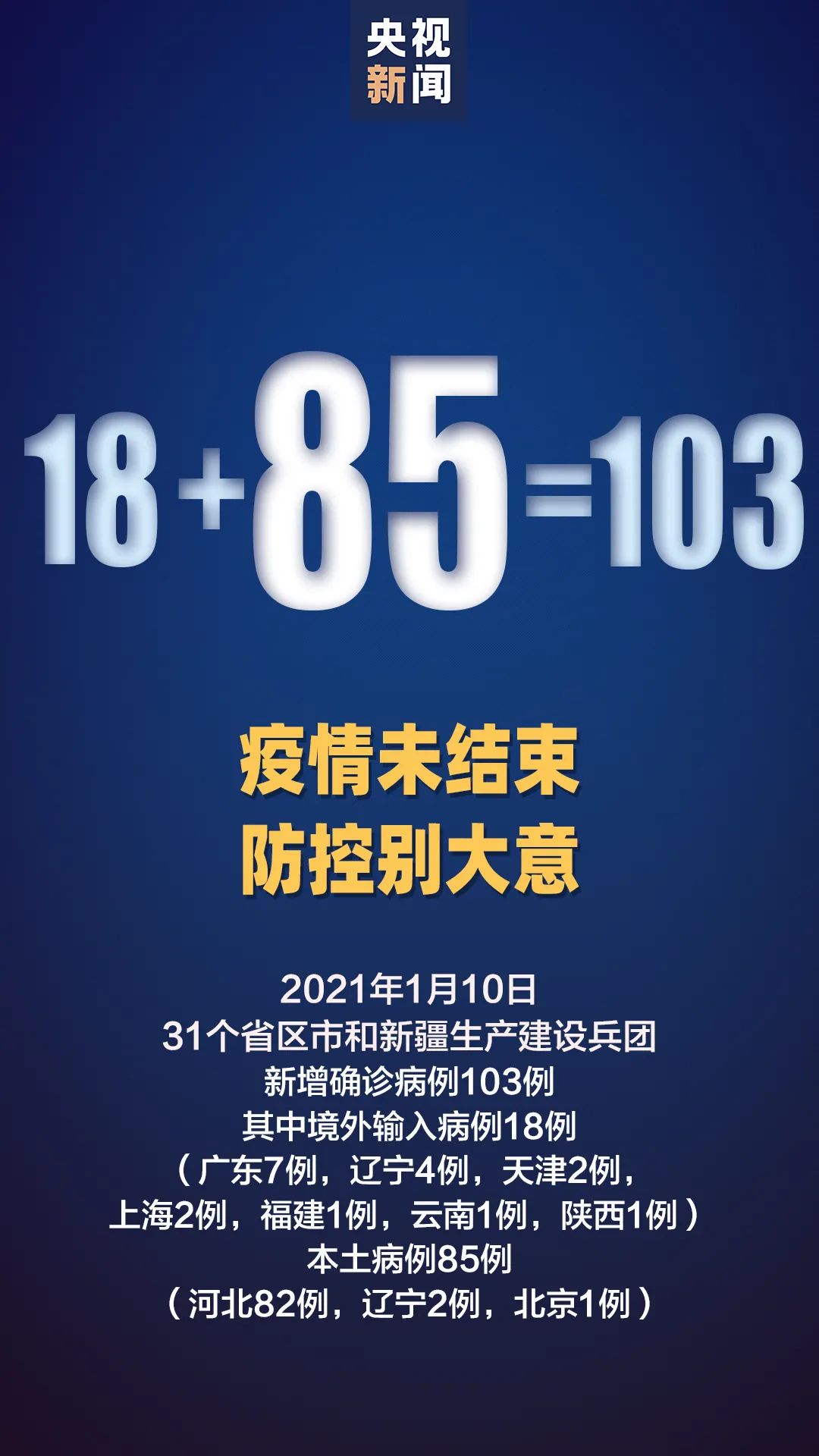 1月10日0—24时,31个省(自治区、直辖市)和新疆生产建设兵团报告新增确诊病例103例,其中境外输入病例18例(广东7例,辽宁4例,天津2例,上海2例,福建1例,云南1例,陕西1例),本土病例85例(河北82例,辽宁2例,北京1例);无新增死亡病例;无新增疑似病例。