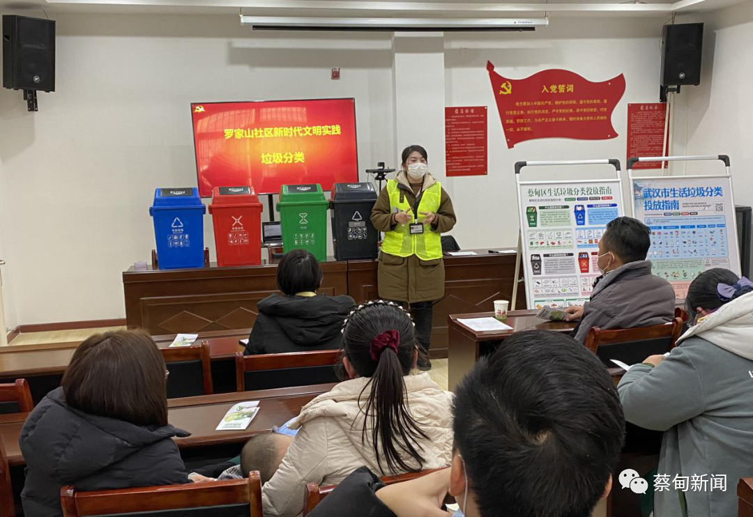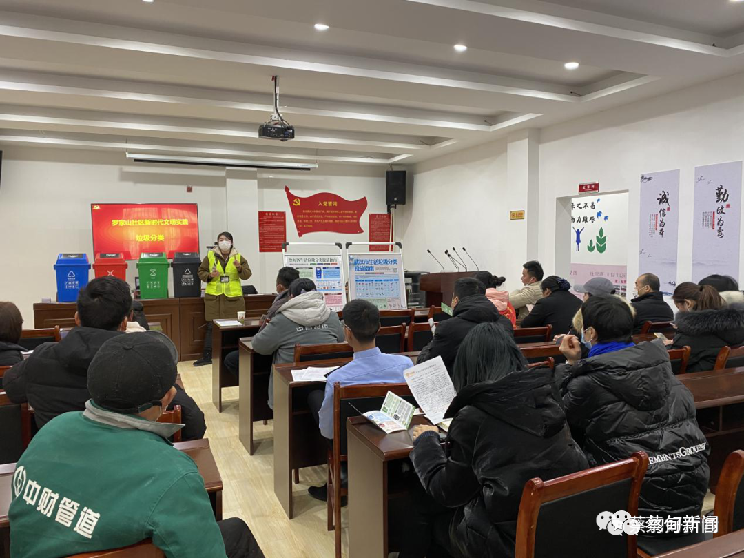 在蔡甸街罗家山社区开展的“垃圾分类 从我做起”的主题宣传活动中,蔡甸街垃圾分类宣讲团成员为辖区居民代表、物管人员、商铺代表、社区工作人员讲解垃圾分类知识。
