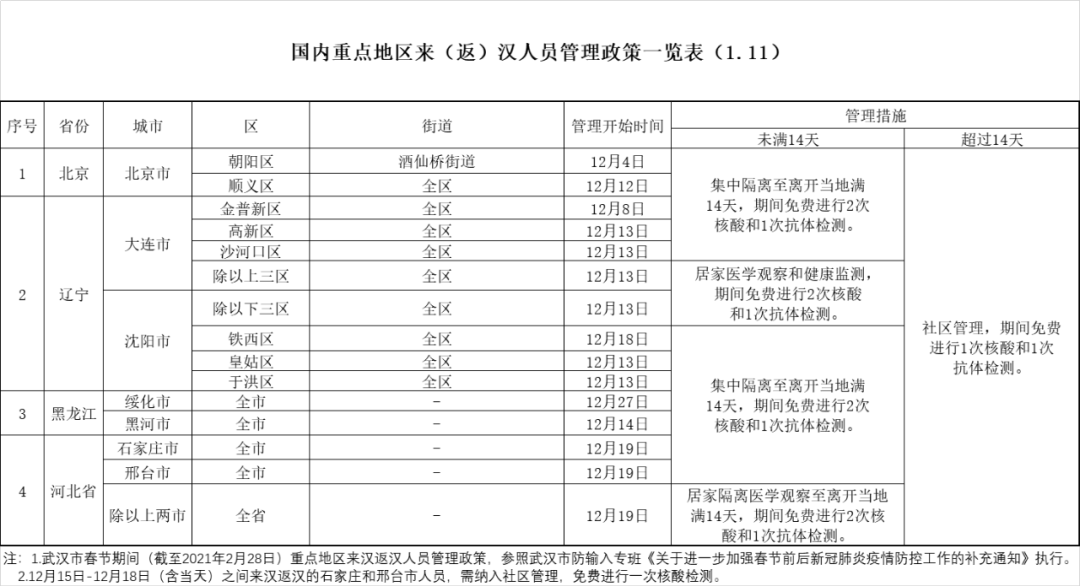 国内重点地区来(返)汉人员管理政策一览表(1.11)