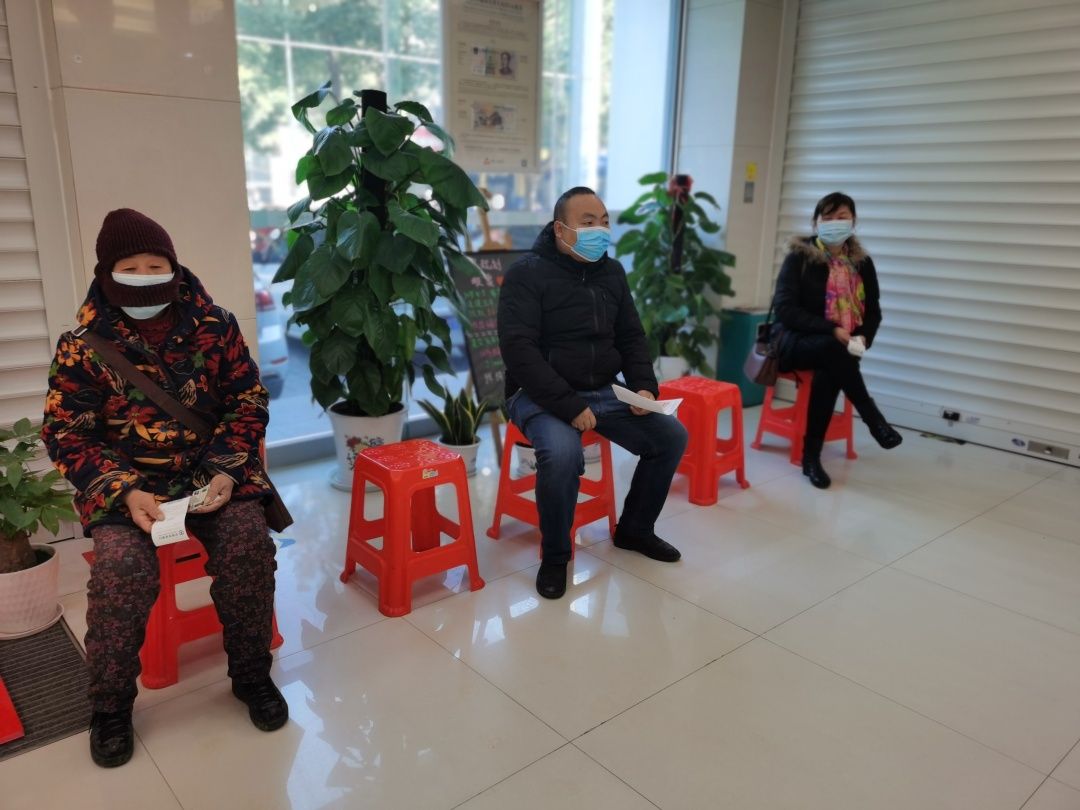 在营业厅一角,前来办理业务的群众坐在间隔一米摆放好的红色椅子上。对于在沙发上等候叫号的群众,工作人员会上前提醒,保持间隔。