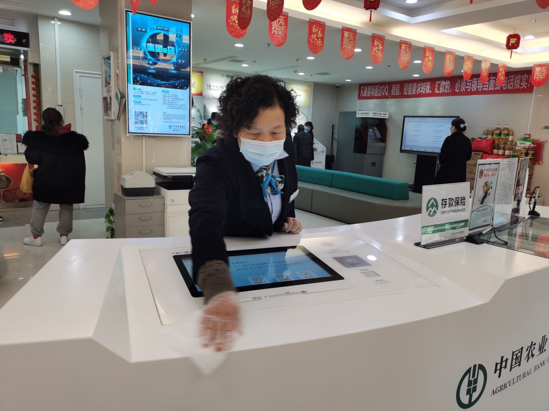 记者看到,银行每位工作人员都佩戴口罩和一次性手套,负责大厅保洁的工作人员抹布一直不离手,有市民办理完业务离开柜台后,工作人员立刻上前,对柜台等进行擦拭消毒。自助服务机则是使用酒精湿巾进行擦拭消毒。