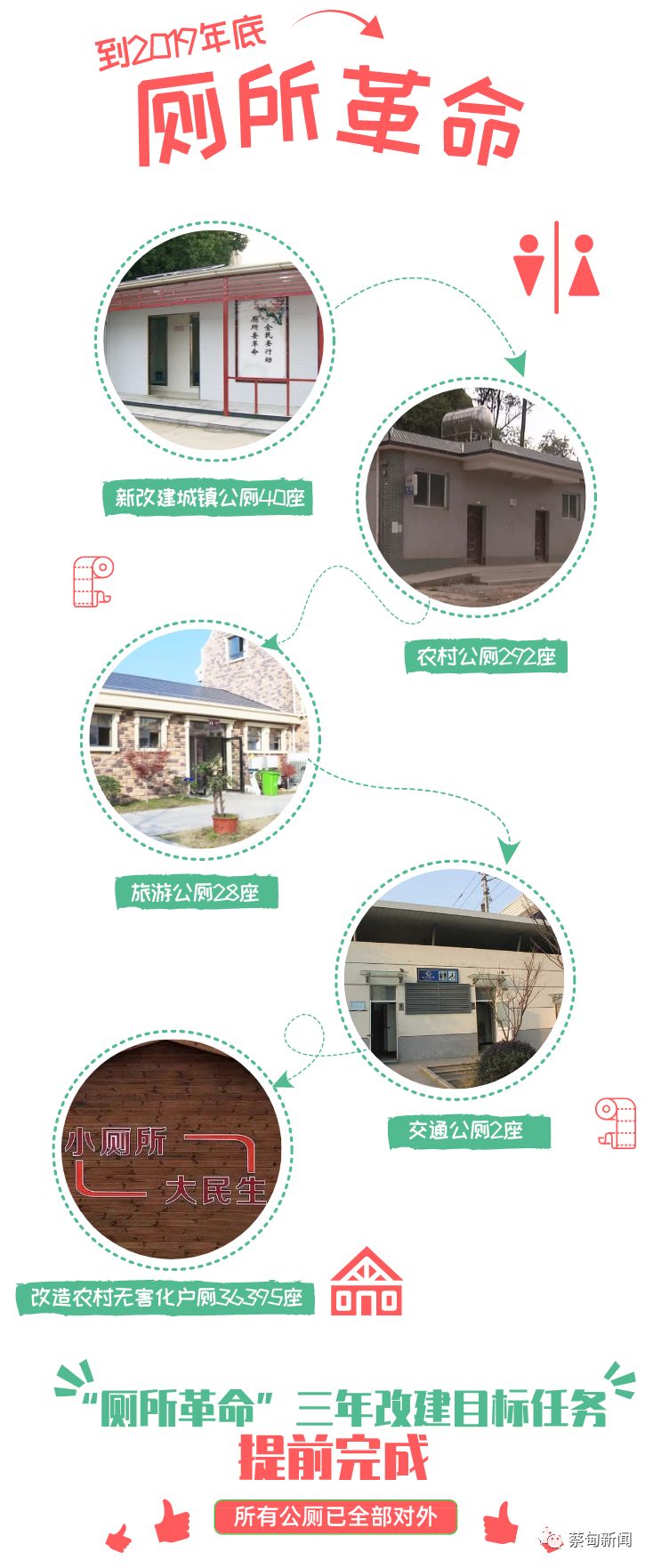 到2019年底,新改建城镇公厕40座、农村公厕292座、旅游公厕28座、交通公厕2座、改造农村无害化户厕36395座。“厕所革命”三年改建目标任务提前完成,所有公厕已全部对外开放。