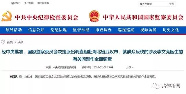 国家监委决定派调查组赴武汉就涉及李文亮医生的有关问题作全面调查 2020-02-08 09:22 人民日报 蔡甸区融媒体中心 0 经中央批准,国家监察委员会决定派出调查组赴湖北省武汉市,就群众反映的涉及李文亮医生的有关问题作全面调查。 (作者:蔡甸区融媒体中心)