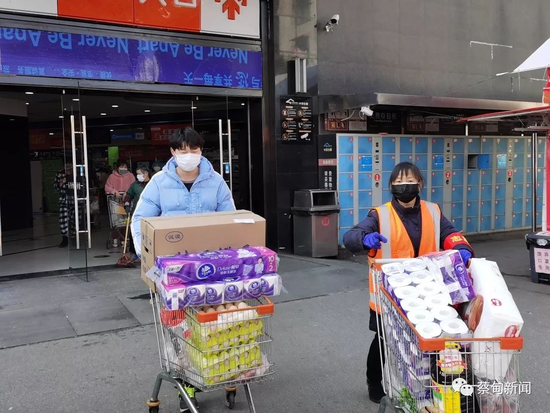 “还要买抽纸、面包、泡椒、土豆,我们还要再进去一趟,继续采买。”龚万梅和同事将2车物资装车,核对完清单后,又匆忙地推着车,回头走进了超市入口。